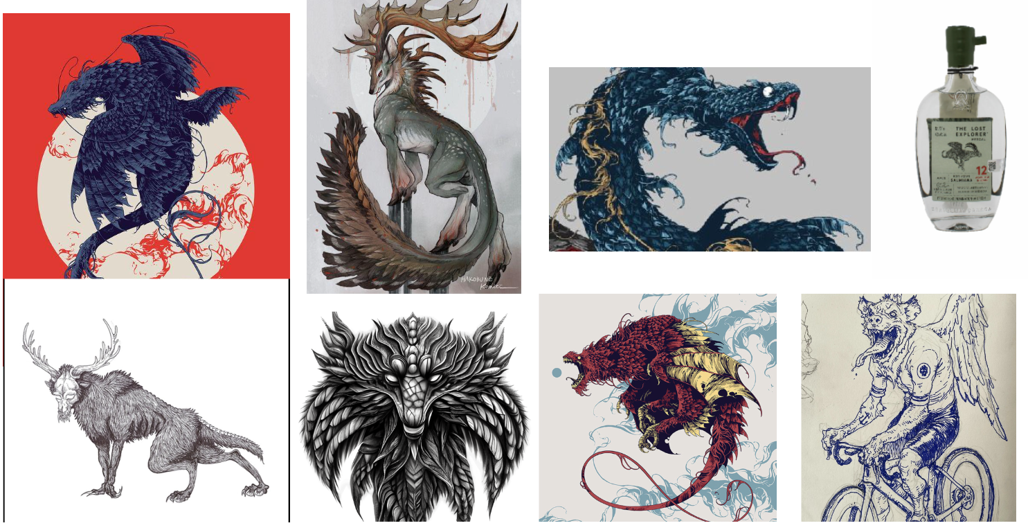 Mood board used to show the fantastical creatures that alebrije figures are based off of; usually a mix of two or three creatures.