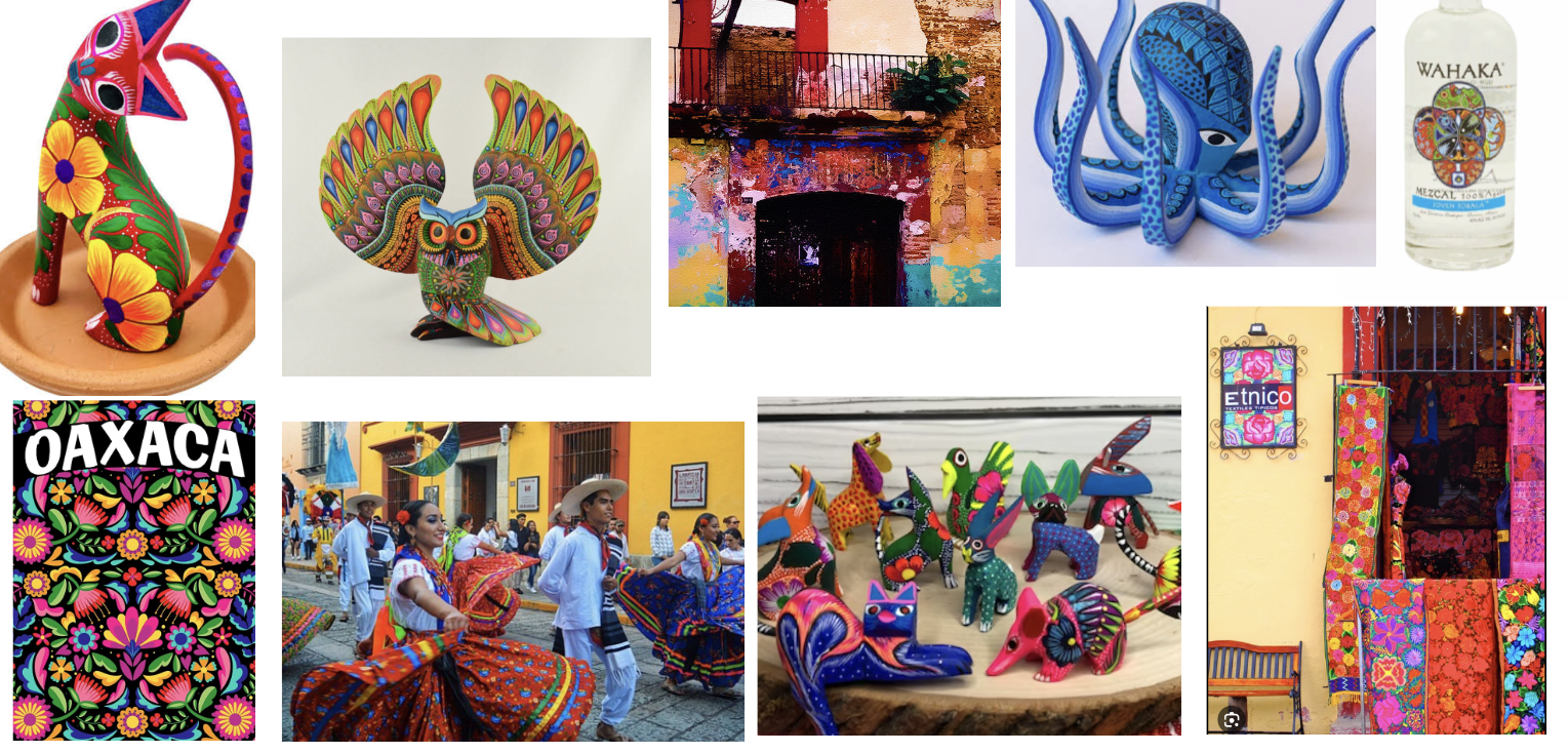 Mood board for the importance of color when creating alebrije figures. All alebrije figures portray multiple vibrant colors or color shades to give off a fantastical feeling