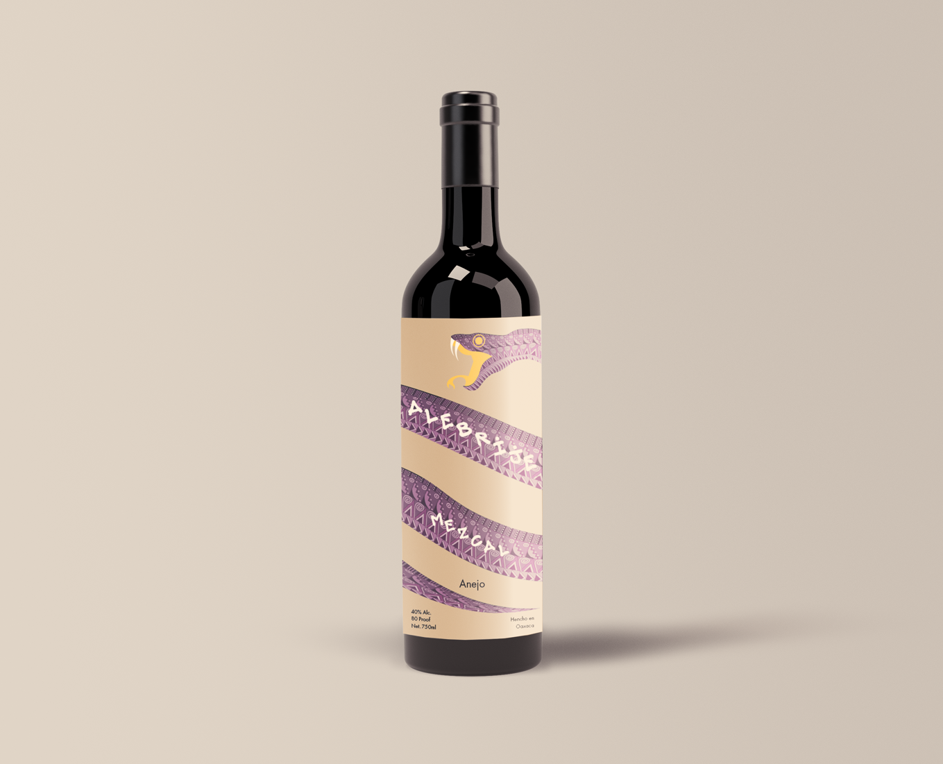 Alebrije Mezcal is a fictional liquor company inspired by Alebrije figurines made in Oaxaca. When developing the packaging label for their signature mezcal, the objective was to reflect the natural aspect of making mezcal and alebrijes. All mezcal comes from agave and all alebrijes are carved naturally by hand. I explored using several bold color combinations and the use of fantastical creatures to evoke the feeling of Alebrije figurines and the Oaxacan region. The final design uses a snake design and a bold colorful type treatment.
