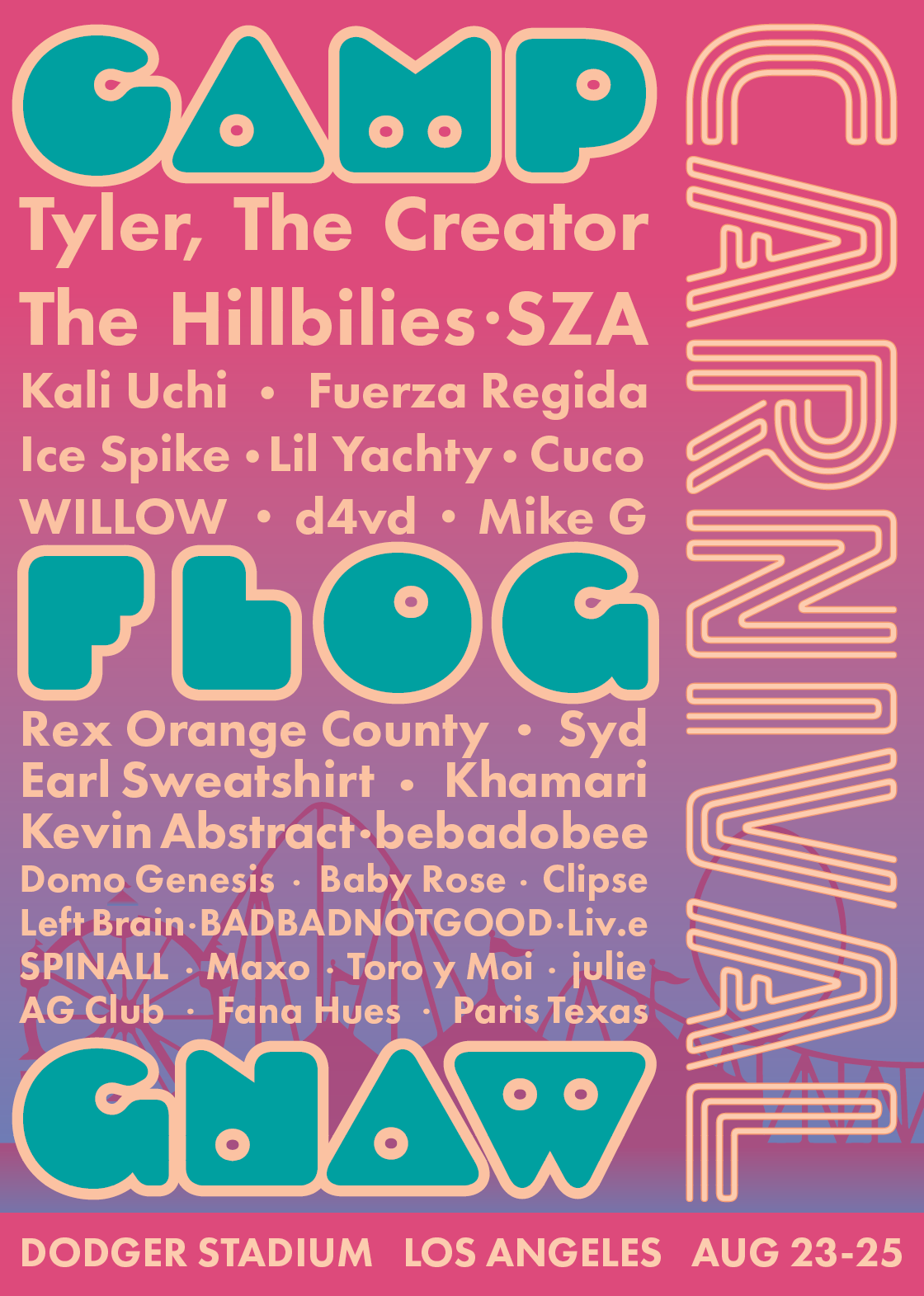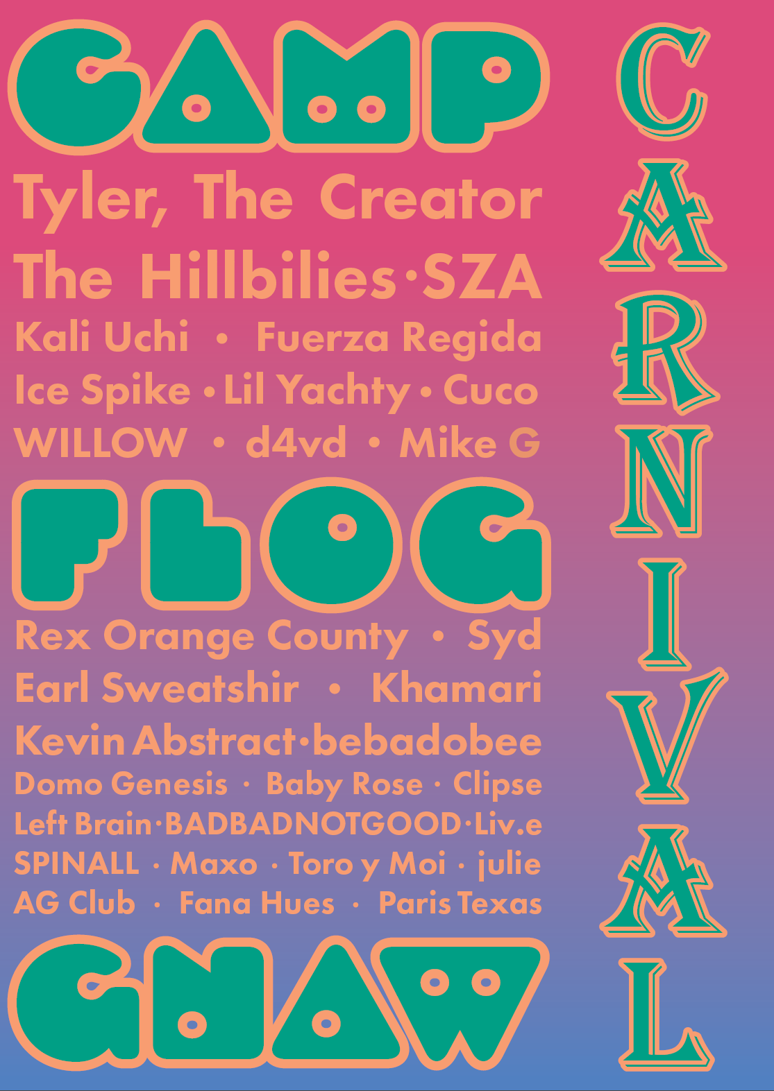 Redesign for Camp Flog Gnaw Carnival poster, fun and colorful design giving off cool vibes; elements that are similar to Tyler The Creator’s art style.