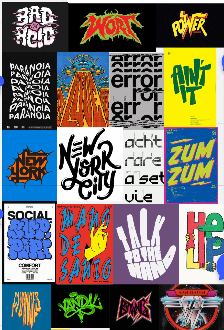 Mood board for chaotic display type that also features interesting type effects like distortion, fitting, placement, and addition of aspects beyond type like hands, shapes, or bubbles.