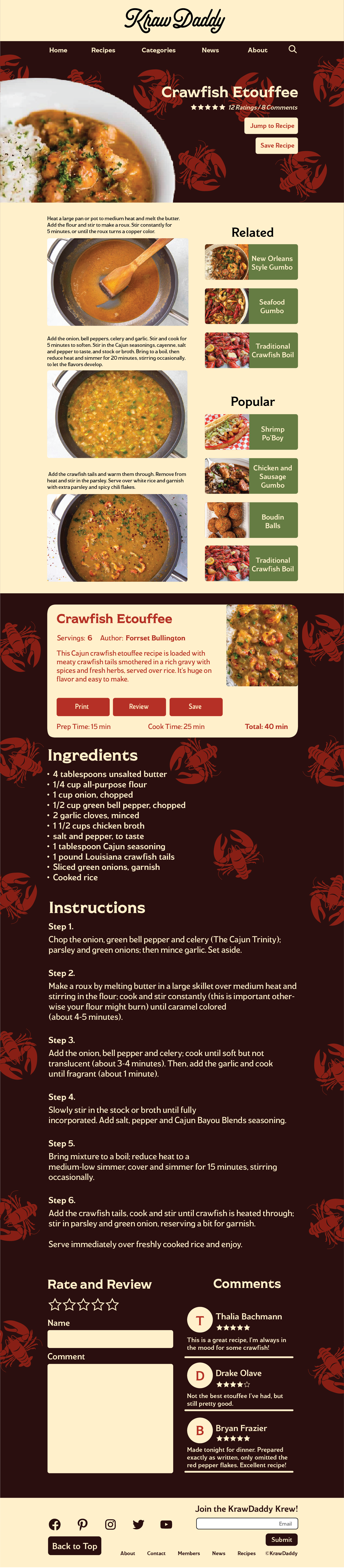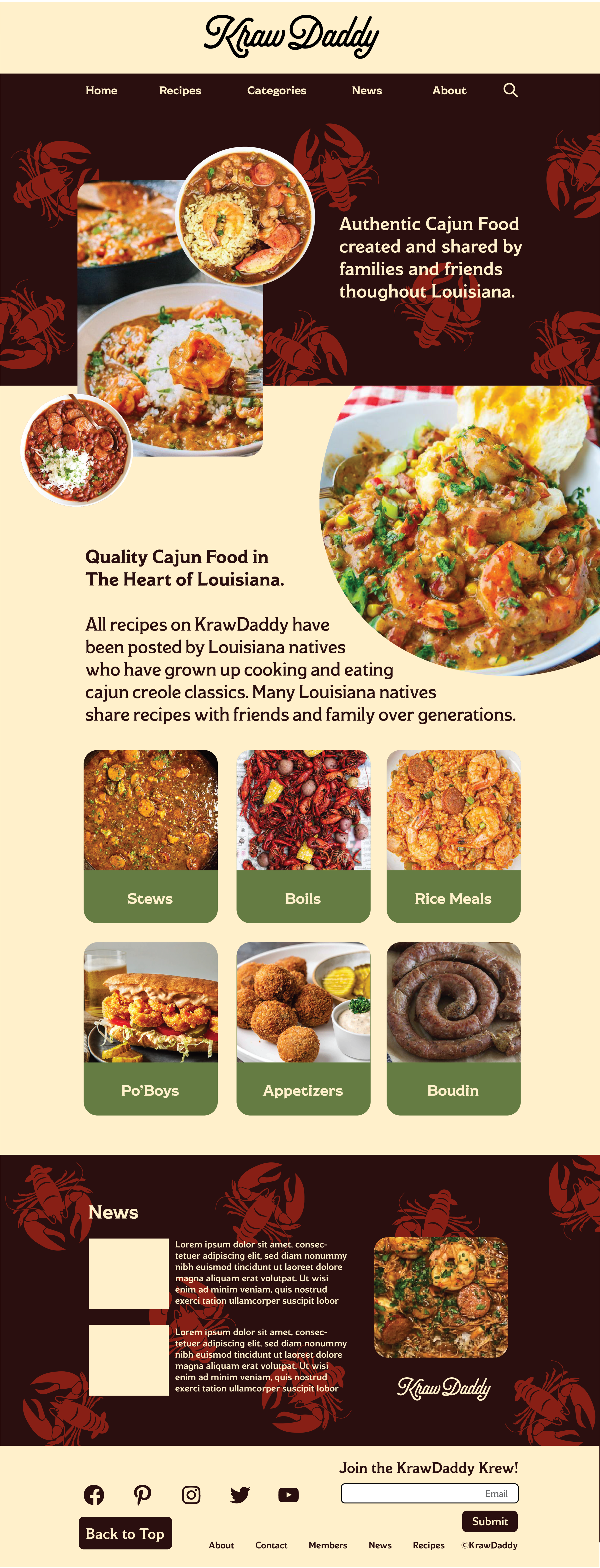 Website layout design for KrawDaddy, fictional site with recipes and news posted by true Cajun and Creole family members native to Louisiana.